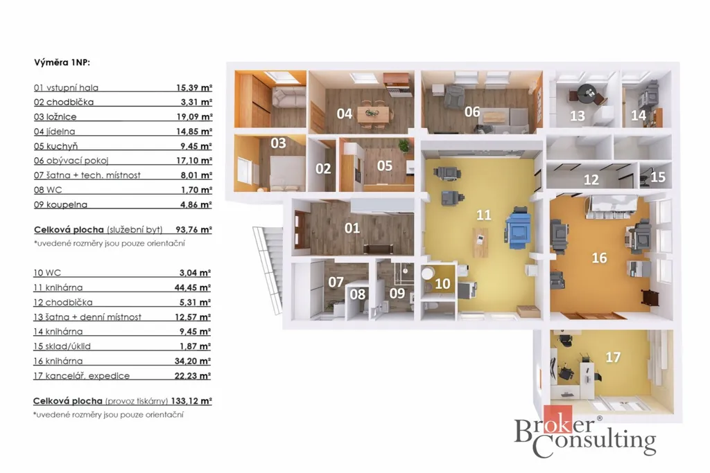 - Výrobní část (133 m²) – možnost přebudovat na bytové jednotky nebo možné využít pro drobnou výrobu, sklady, kanceláře, služby či obchodní prostory. Disponuje kancelářskými prostory a samostatným sociálním zázemím.