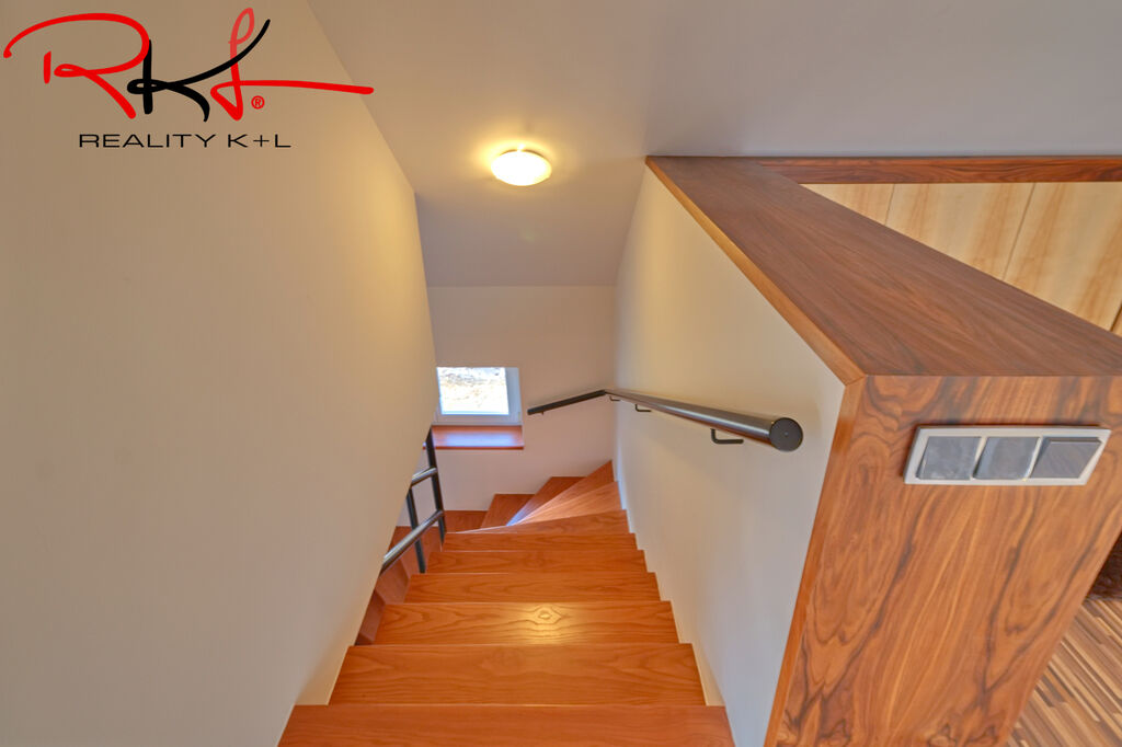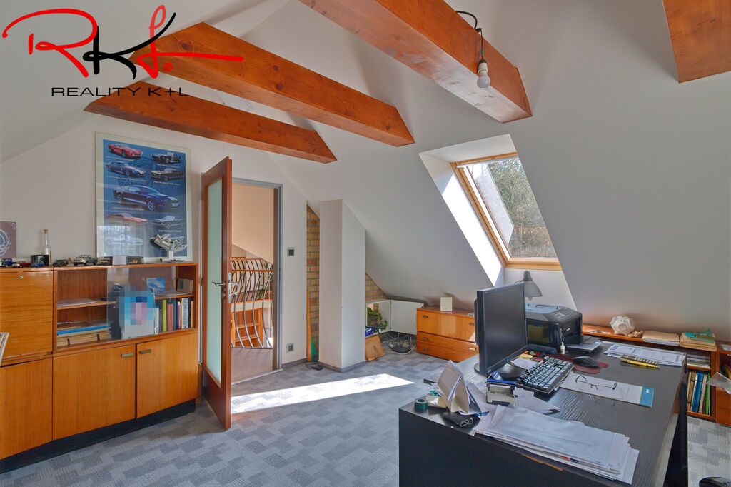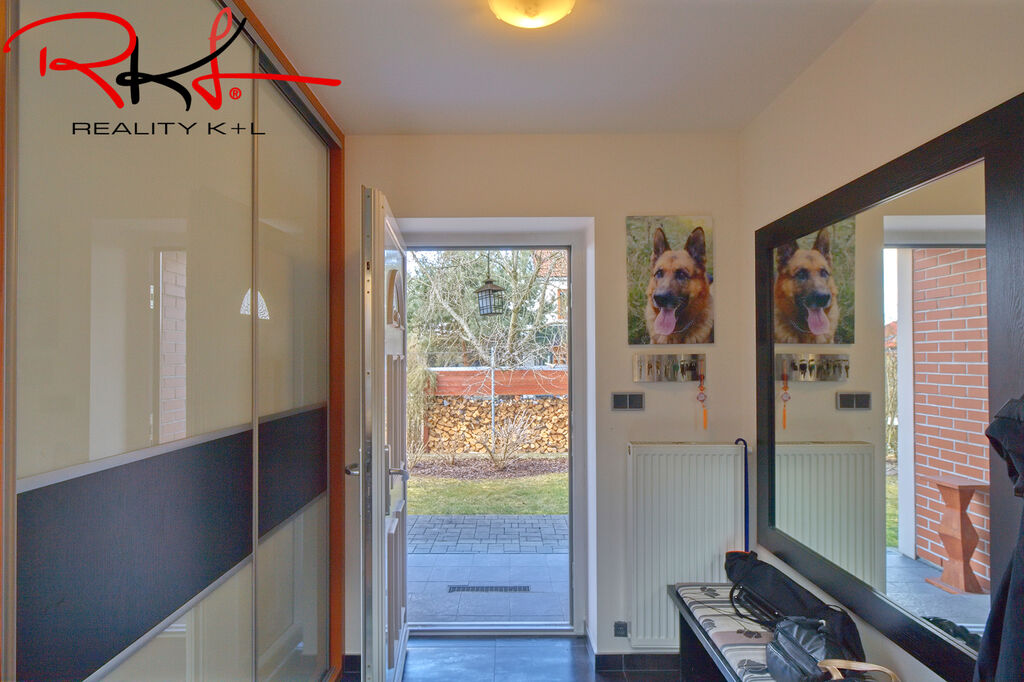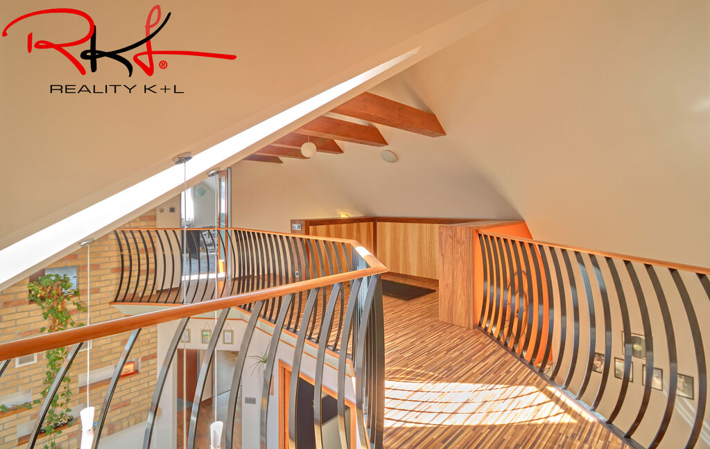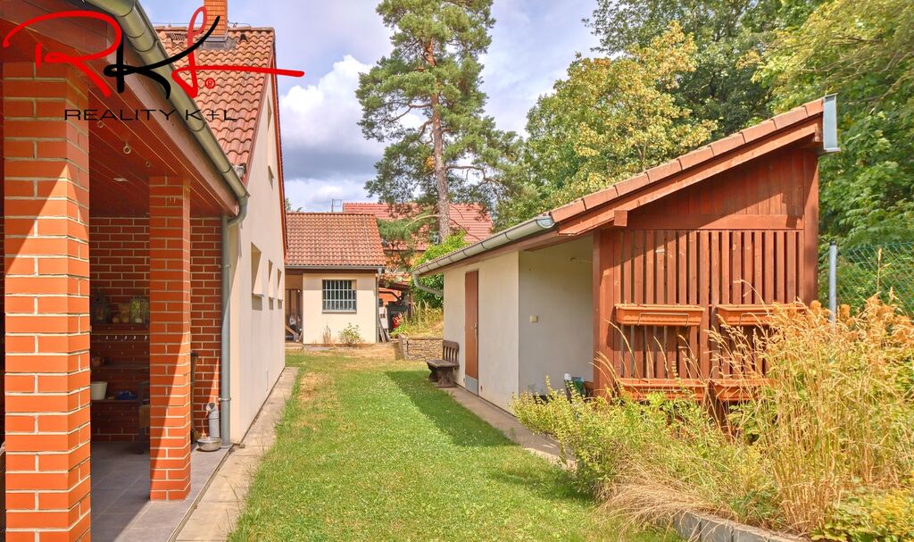 Dominantou domu je otevřené atrium s lávkou a výhledem na přízemí. Terasa u domu poskytuje ideální zázemí pro relaxaci. Na pozemku se nachází dvougaráž s dílnou, zastřešené stání pro karavan, zahradní domek na nářadí a studna. K dispozici je krytý venkovní bazén se schody, o rozměrech 6 × 3 m, hloubka 140 cm. Udržovaná okrasná zahrada disponuje automatickou závlahou.
