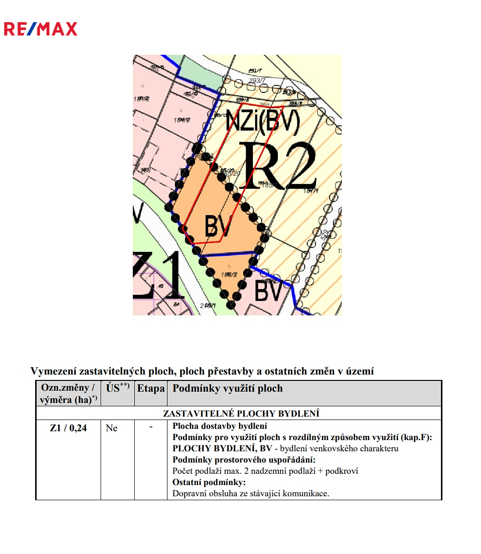 Pozemek se nachází v oblasti označené jako BV – bydlení venkovského charakteru. To umožňuje výstavbu rodinných domů či venkovských usedlostí s integrovaným hospodářským zázemím. Maximální povolená výška zástavby je 2 nadzemní podlaží a podkroví. Pozemek je z větší části určen pro výstavbu rodinného domu, menší část je evidována jako rezerva (viz přiložené fotografie).