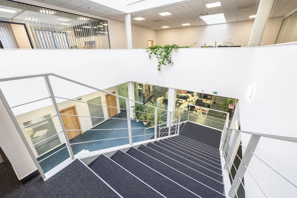 Prostory jsou kompletně vybavené kvalitním nábytkem a jsou situovány do dvou pater (přízemí + 1. patro) propojené vnitřním schodištěm se světlým atriem. Každé patro má vlastní vstup, kuchyňku i toalety. Kanceláře ve vrchním patře mají zdvojené skleněné příčky. Mezi další vybavení patří: serverovna, optika, datové rozvody, vnitřní kamerový systém, klimatizace, ostraha areálu, napojení na PCO.