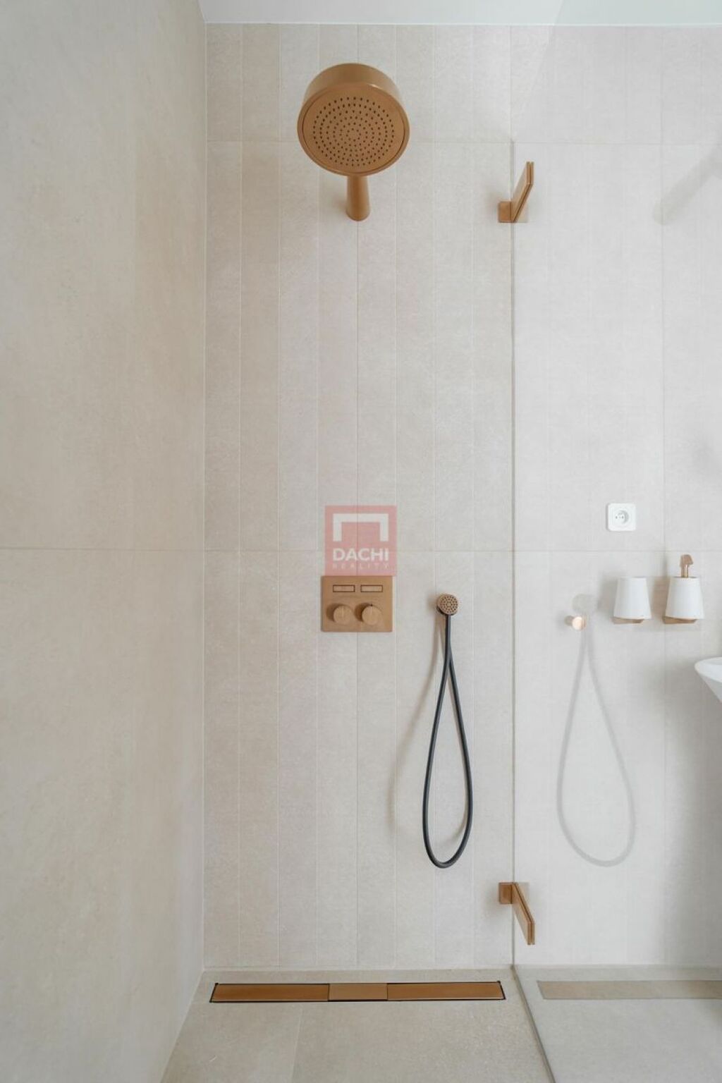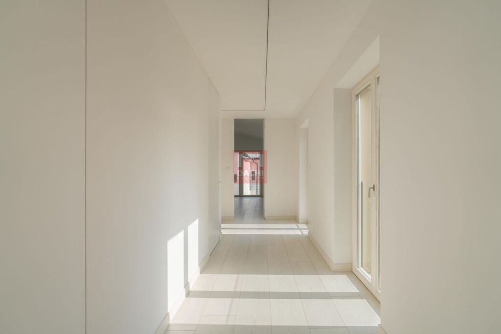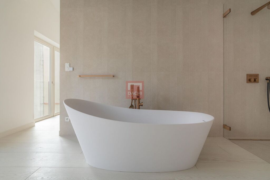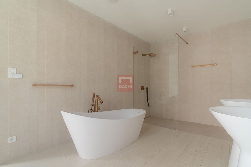 Penthouse je vybaven špičkovými prvky: koupelny Gessi, osvětlení Modular, dřevěné podlahy Foglie DOro z dílny Valen and Masar, prémiová keramika Porcelanosa. Celkový dojem podtrhují bezfalcové dveře až ke stropu, které přirozeně navazují na výšku stropů a podtrhují nadčasovou eleganci celého prostoru.