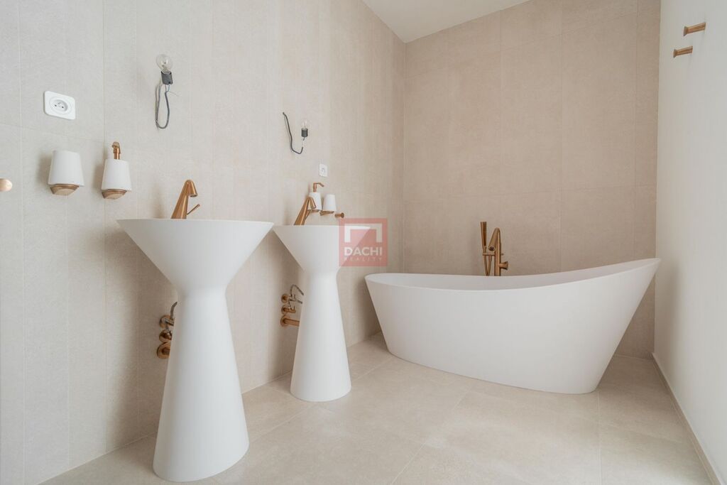 Dispozice zahrnuje tři samostatné ložnice, přičemž komfortní zázemí pro každodenní užívání zajišťují dvě samostatné toalety, každá vybavená bidetem a umyvadlem, a dále dvě plnohodnotné koupelny, které jsou navrženy ve vysokém standardu vždy s dvěma umyvadly, prostornou sprchou i vanou. Hlavní koupelna, která je přístupná přímo z ložnice, navíc vytváří atmosféru soukromého spa, ideální pro chvíle relaxace a klidu.