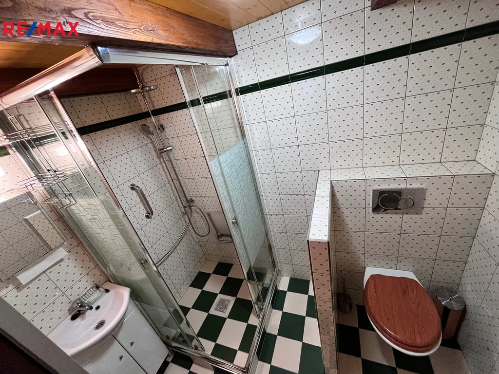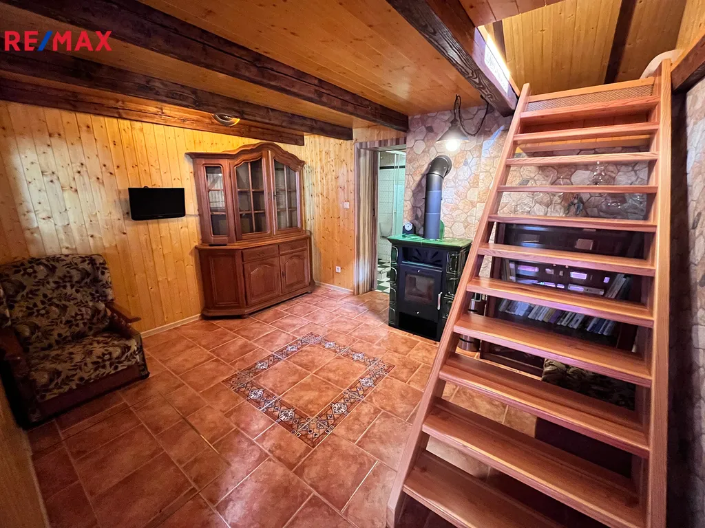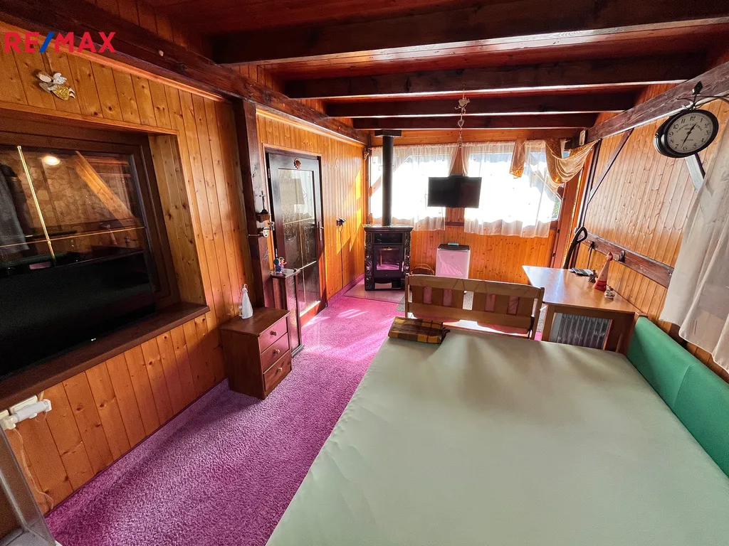 Jedná se o prodej chaty o zast. ploše 65m2 na pozemku o celkové výměře 365m2 v okrajové části Humpolce. Dispozičně je objekt tvořen v přízemí vstupním letním pokojem 14,95m2, pokojem s krbovými kamny 11,03m2, kuchyní 5,33m2, šatnou s vestavnými skříněmi 5m2, koupelnou se sprchovým koutem a WC 3,11m2, venkovním pokojem 7,25m2, podkrovním pokojem 17m2. Část objektu je podsklepena 6,15m2, nachází se zde skladová plocha a bojler.