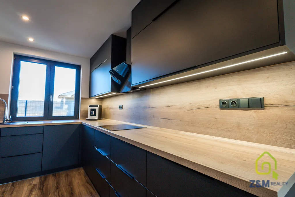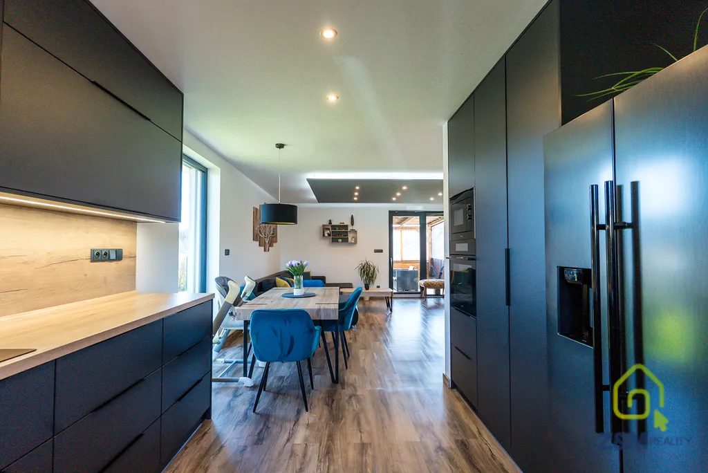 Dům je vybaven moderním interiérem , s krásnou stylovou kuchyní ,okna jsou plástová v barvě antracitu vyztužena ocelovým rámem a trojskla vnitřní dveře jsou obložkové bez falcové. Hlavní okna jsou opatřeny žaluziemi CLIMAX 90 Z, každá žaluzie je řízena radiovým signálem v každé místnosti samostatně a celý okruh lze řídit i z jedné časti.