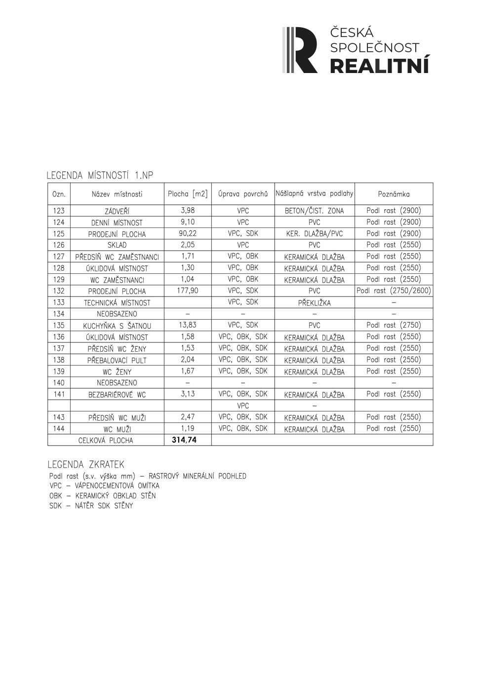 Celková výměra činí 314,74 m2 se zázemím.