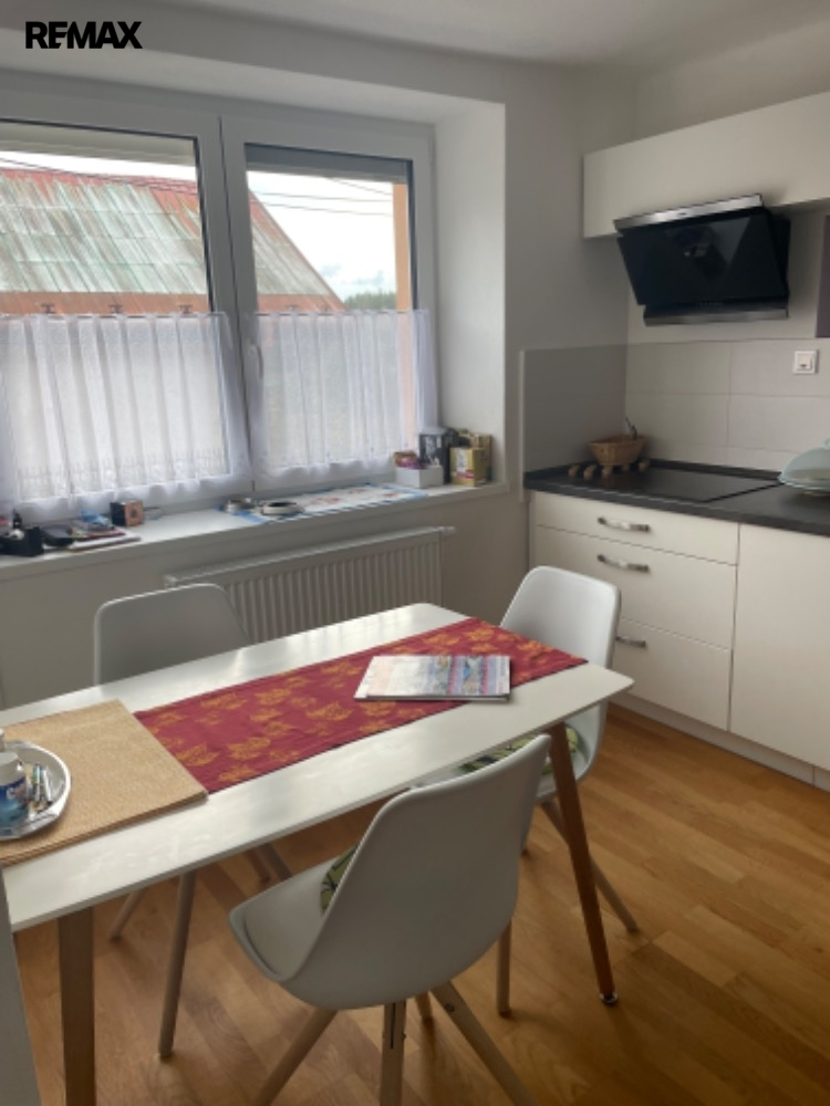 Kuchyň je prakticky vybavena spotřebiči značky Oresi, včetně sklokeramické desky, horkovzdušné trouby, digestoře, myčky a vestavěné lednice. V obytných prostorách v přízemí je dubová podlaha, zatímco v patře dominují selská prkna, což dodává domu charakter a teplou atmosféru.