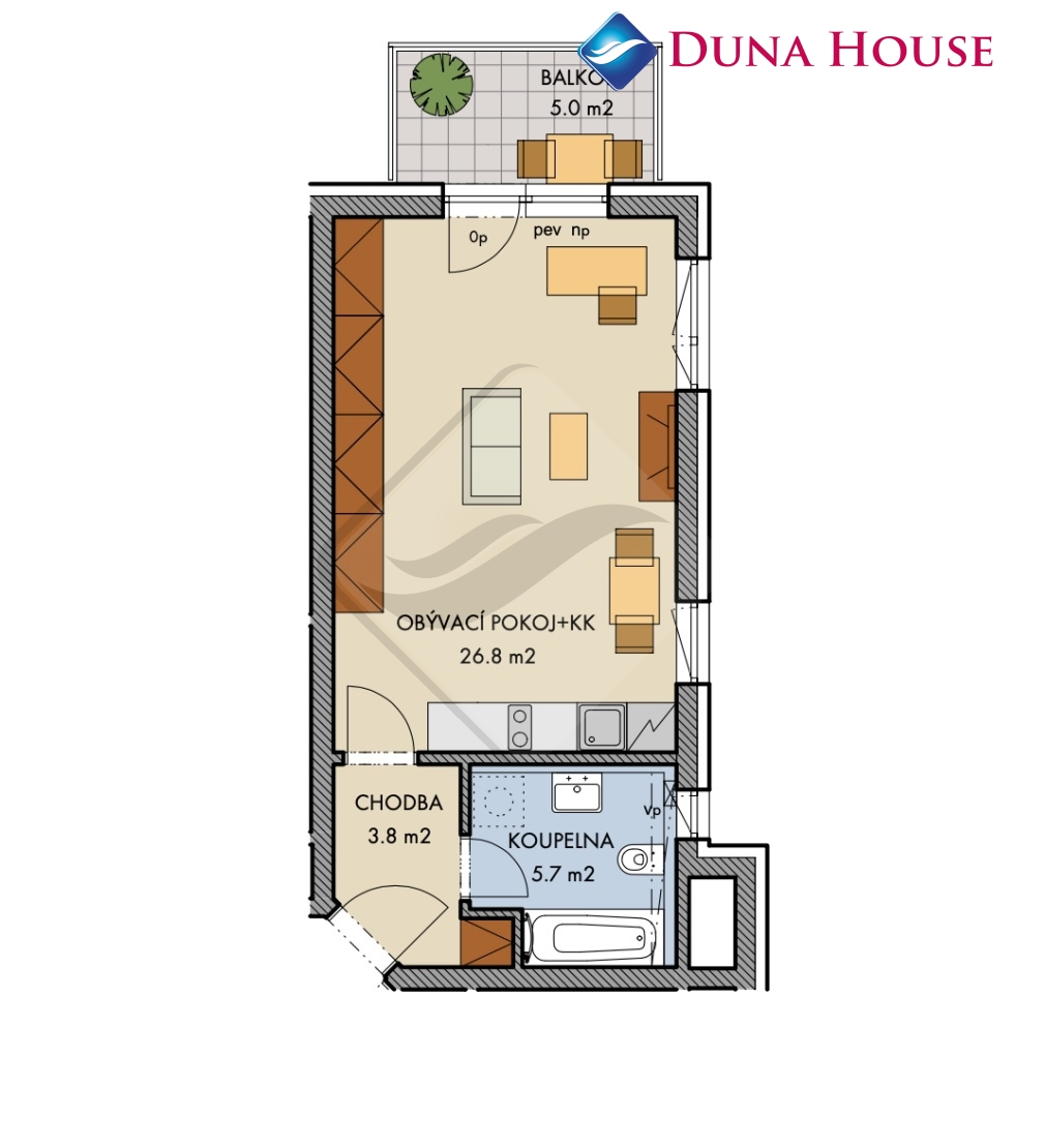 Jednotka je plně vybavena a připravená k okamžitému nastěhování. Disponuje prostorným pokojem s elegantní plně vybavenou kuchyňskou linkou, velkou šatní skříní, koupelnou s vanou a toaletou. K bytu náleží také balkon o velikosti 5 m², ideální pro klidné posezení s výhledem na okolní zeleň. Díky rohové orientaci na západ a sever je byt příjemně světlý a zároveň chráněný před přímým letním horkem.