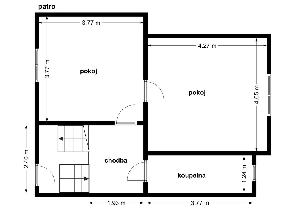 suterén - garáž 30.0, přízemí - vstupní chodba 7.7, obývací pokoj 15.4, pokoj 20.9 do ulice (orientace JJZ), jídelna 11.8 s kuchyňskou linkou, výstup na spodní terasu 18.8 (dále je venku skleník 13.5 a horní terasa 18.2 - orientace SSV), koupelna 4.0 se sprchovým koutem, umyvadlem a toaletou, skládek 16.5 m2, mezipatro - kuchyňka, patro - dva pokoje, koupelna s vanou, umyvadlem a toaletou.