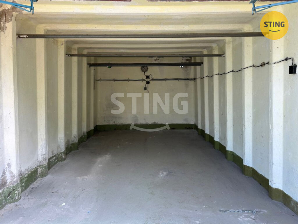 Garáž má zastavěnou plochu 18 m2, je z betonového monolitu s rovnou střechou, je zde rovněž rozvod elektřiny, momentálně nepřipojený. Vrata jsou plechová zabezpečená dvěma zámky.
