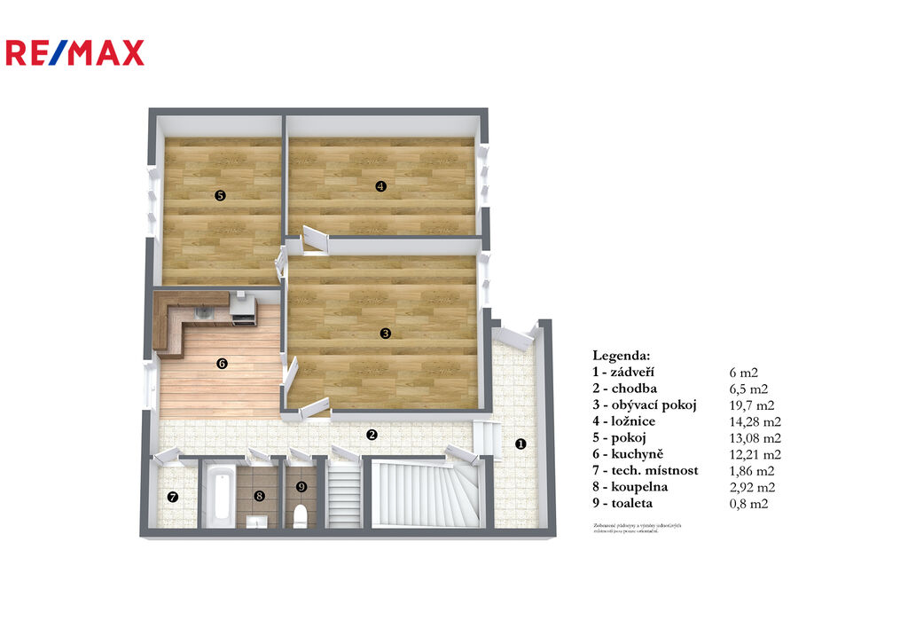 Dispozice: vstupní chodba, kuchyň s jídelní částí, obývací pokoj, ložnice, pokoj, technická místnost, koupelna, záchod.