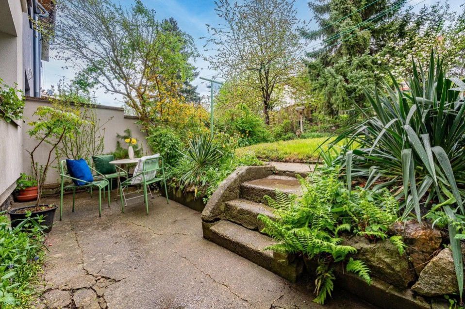 Za domem se nachází krásná, zelení obklopená zahrada, která poskytuje pocit soukromí a klidu. Tato oáza je ideální pro posezení s rodinou nebo přáteli a skvělá pro grilování. Přímý vstup ze zahrady do obývací části zajišťuje komfortní propojení interiéru s exteriérem.