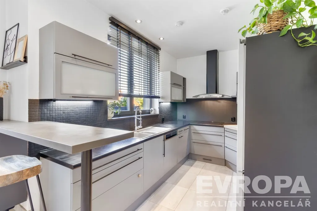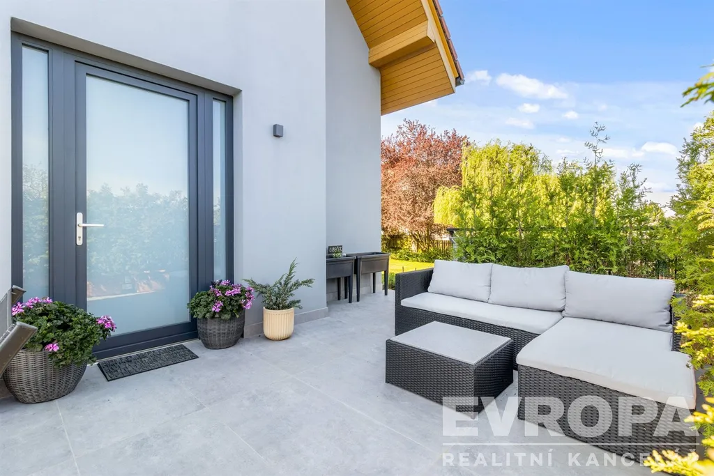 V přízemí se nachází vzdušný obytný prostor propojený s kuchyní a jídelnou, s přímým vstupem na zahradu s terasou. Ta je vybavena bioklimatickou pergolou, vířivkou, grilovacím koutem a venkovním betonovým stolem. Dále je zde samostatný pokoj, koupelna s WC a prostorné zádveří. Vstup do domu vede přes jižní terasu s krásným výhledem do okolí.