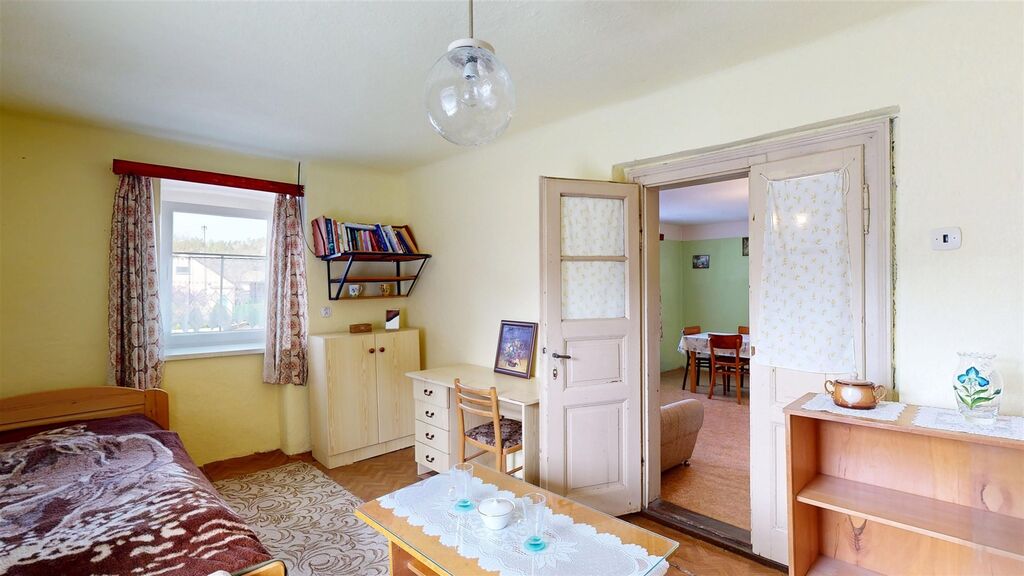 Rodinný dům je v obyvatelném stavu, má nová plastová okna, lokální topidla na tuhá paliva, je částečně podsklepený a nabízí možnost rozšíření obytného prostoru do podkroví.