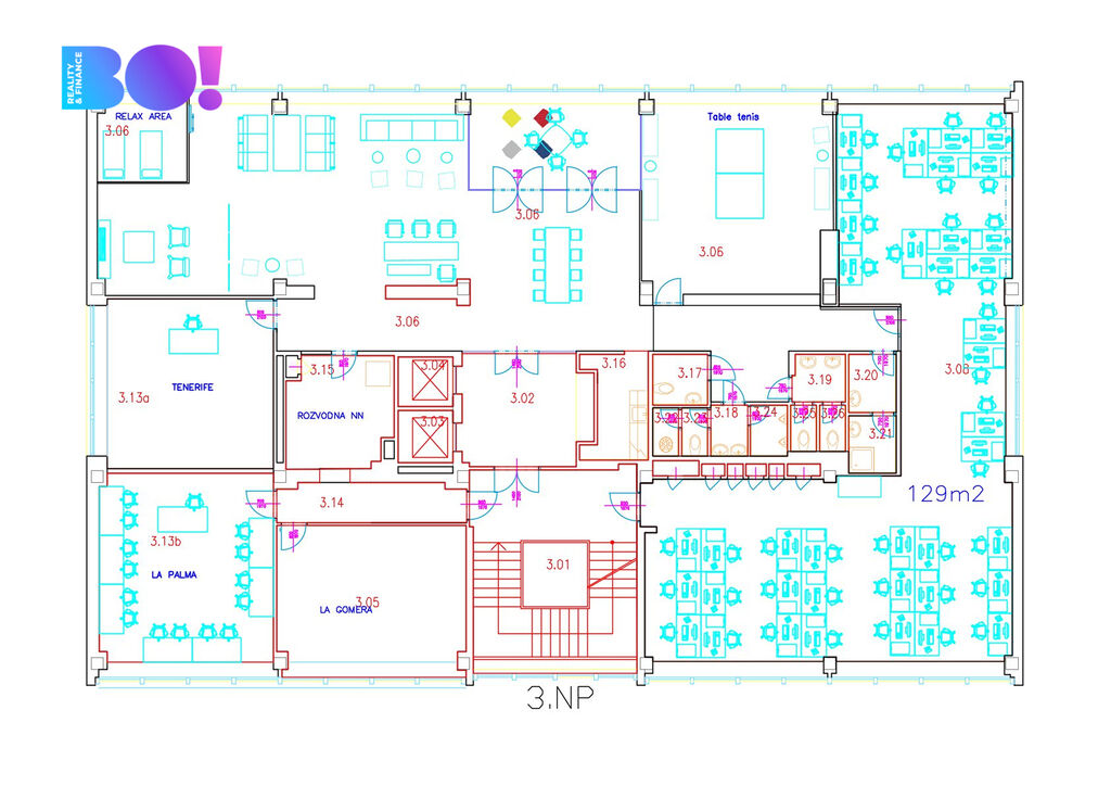Prostory se nachází ve 3.NP a jsou rozčleněny do centrálního open space a samostatných kanceláří. Po dohodě s majitelem jsou možné úpravy prostor, případně možnost pronájmu i 4.NP. Budova prošla celkovou revitalizací - je kompletně zateplená, nová plastová okna, klimatizace.....