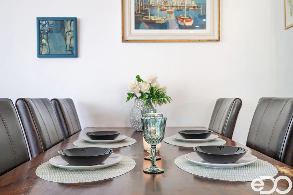 V bytě se nachází předsíň, chodba s vestavěnou skříní, prostorná kuchyně, obývací pokoj s malým plynovým krbem a vstupem na zimní zahradu, koupelna se samostatnou toaletou, ložnice a pokoj se vstupem na zahradu.