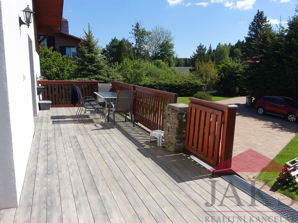 Exkluzivně vám nabízíme na prodej krásný, slunný, prostorný, kompletně zařízený, moderní byt/apartmán 3+kk (93,3 m2) s velkou terasou (26,75 m2) v 1.NP, vlastním wellnessem (masážní vířivka whirpool, sprcha a WC), skladem v suterénu rekreačního domu (5 apartmánů) a parkovacím místem na oploceném pozemku. Tento nadstandardní apartmán se nachází v klidné části v centru horského šumavského městečka Srní (852 m.n.m.), jenž je výchozím bodem a turistickým centrem v této centrální části NP Šumava.