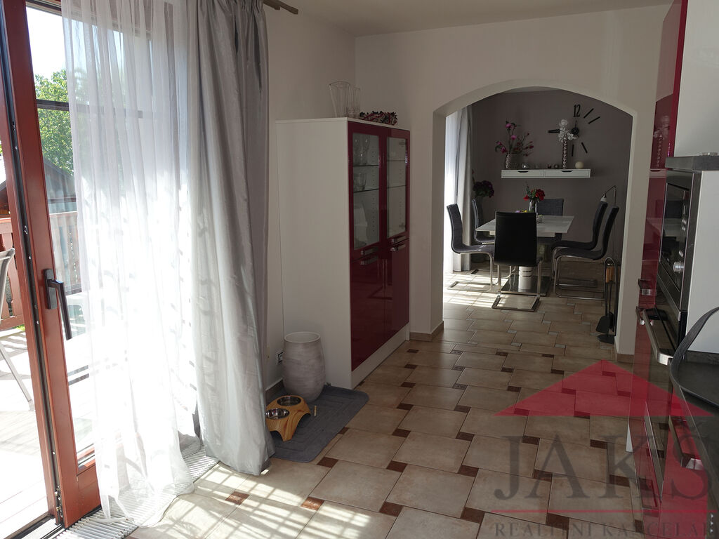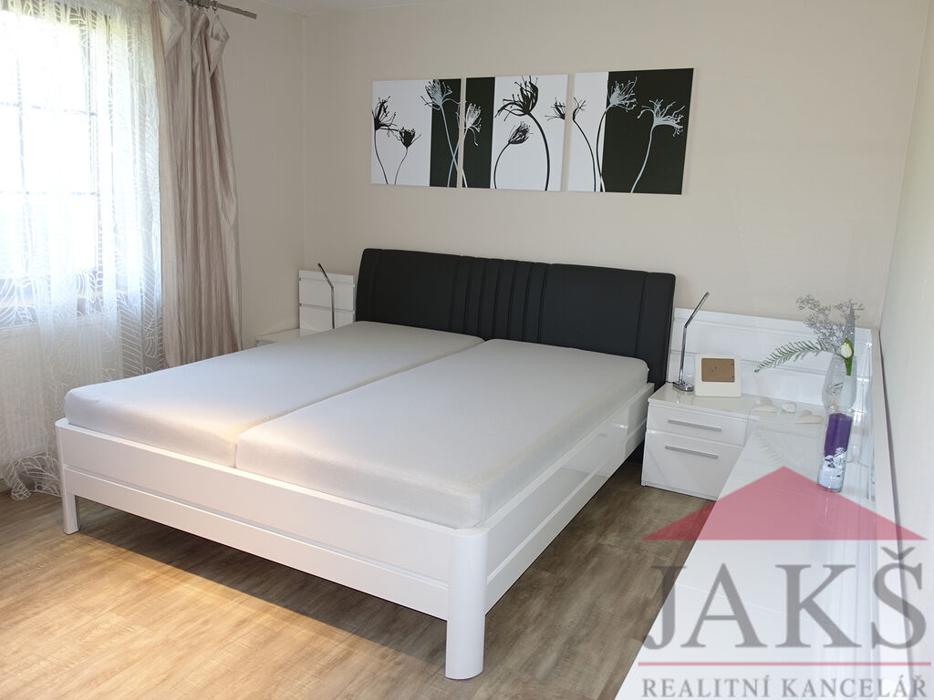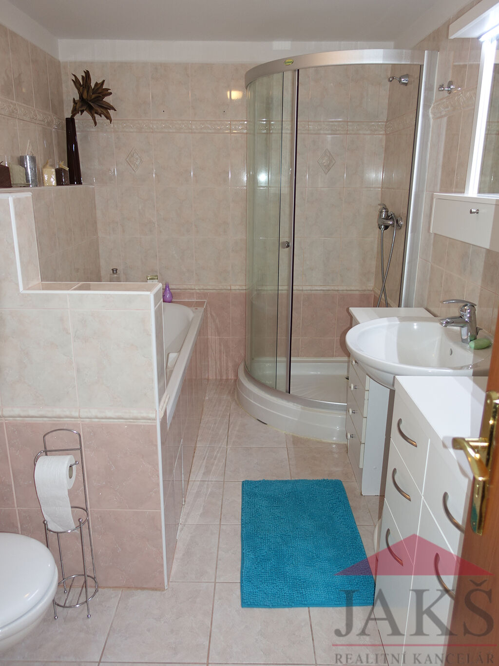Popis: společná chodba se schodištěm; byt 3+kk (93,3 m2): vstupní hala (šatní skříně, zrcadlo), hlavní koupelna 6,55 m2 (vana, sprchový kout, umyv. se zrcadlem, WC, topný žebřík, komoda), prostorný obývací pokoj 37,55 m2 (sedací souprava s internetovou TV) s krbem, kuch. koutem (moderní rohová kuch. linka s vestavěnými spotřebiči: HV trouba, MV trouba, sklo-ker. deska, digestoř, myčka, lednice s mrazákem, RV konvice), jídelnou a dvěma francouzskými okny spojující velkou terasu 26,75 m2 s posezením, hlavní ložnice 17,1 m2 (manž. postel, 2x noční stolek s lampičkou, šatní skříň), ložnice 14,7 m2 s bezbariérovou koupelnou 3,5 m2 (bezbariérová sprcha, umyv., WC, topný žebřík, komoda). Prodej vč. kompletního bytového vybavení!