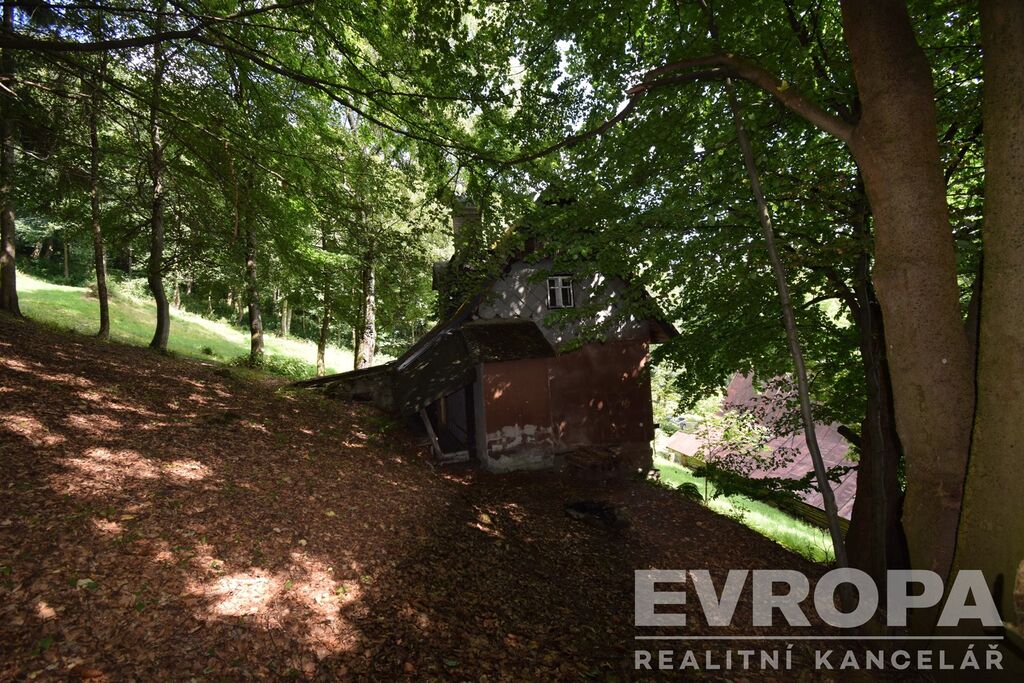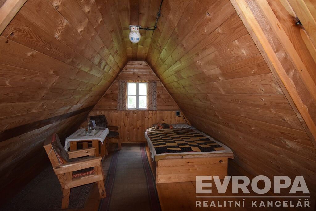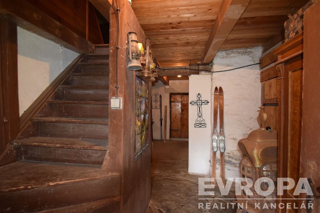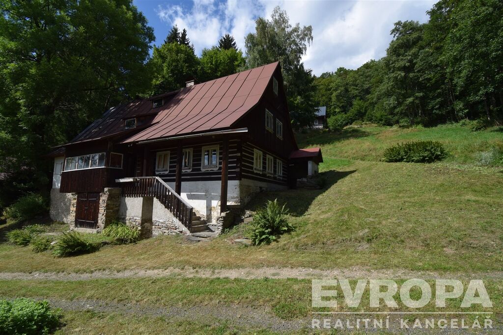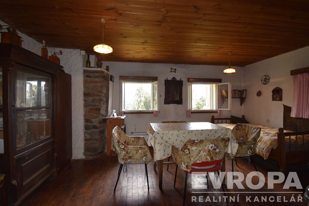 Ve výhradním zastoupení majitele Vám nabízíme roubenou/zděnou chalupu se zastavěnou plochou 150 m2 o dispozici 5+1, postavené na pozemku o výměře 2.585 m2. V přízemí je velká roubená světnice s kachlovými kamny a druhá světnice s kuchyní a koupelnou s WC. V podkrovních částech byly postupně vybudovány tři ložnice ve dvou patrech. Vzhledem k velikosti podkroví je možné vybudování dalšího velkého pokoje nad roubenou částí. Ze stavebního hlediska je statika chalupy bez poškození, dřevěné konstrukce nevykazují napadení škůdci. Opravy a úpravy jsou nutné na elektroinstalaci, komínech a koupelně a celkové modernizaci vzhledem k tomu, že chalupa nebyla posledních deset let užívána.
