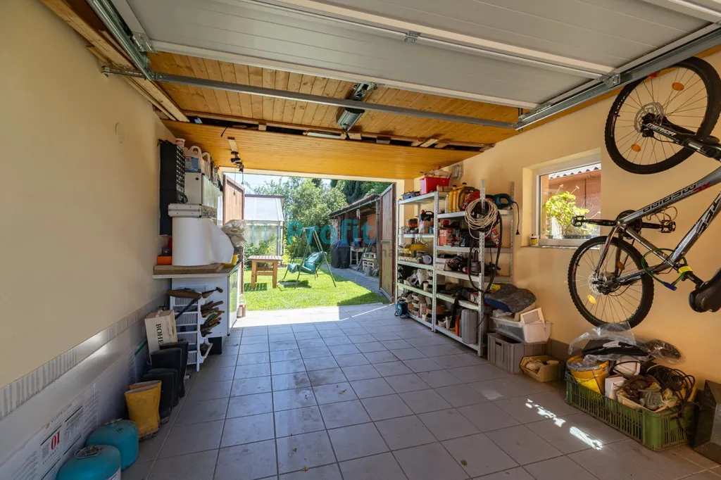 Exteriér: zděná garáž s dílnou (elektrická sekční vrata), která je i průjezdná, plechová garáž, přístavky na dřevo, technická místnost. Na zahradě je také krytá pergola se zapuštěným bazénem, sprchou, posezením s krbem a udírnou. Ideální pro relaxaci i setkávání s přáteli. Udržovaná zahrada.