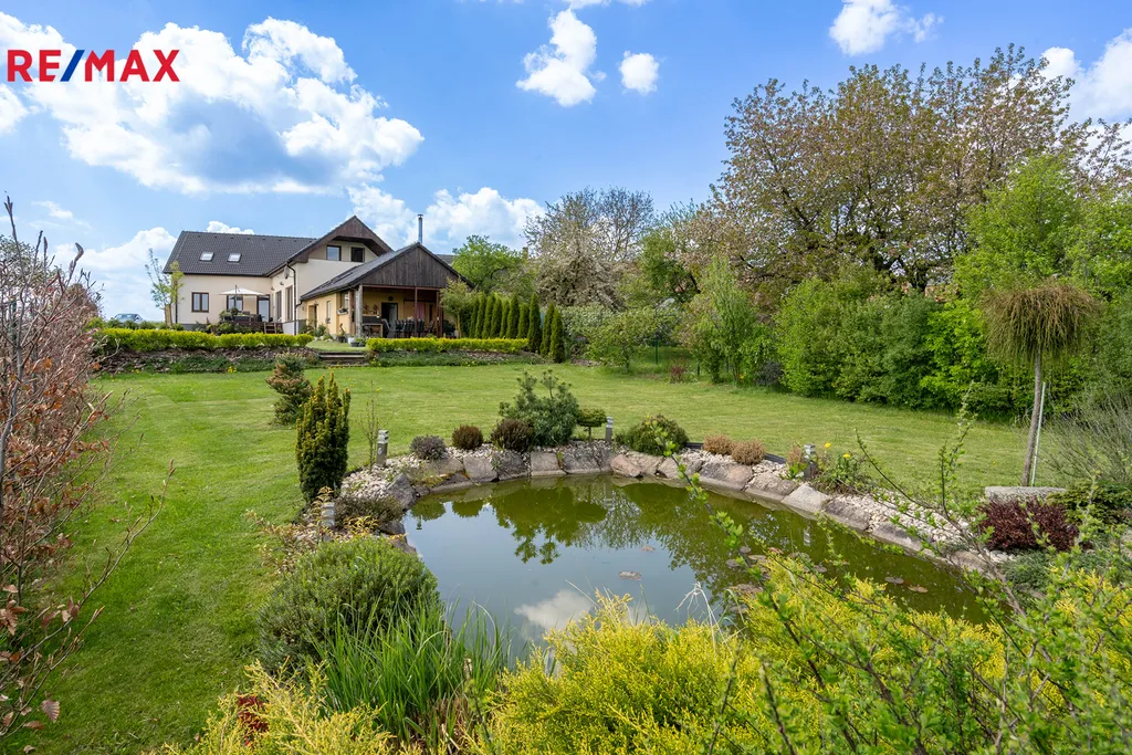 - Zahrada 1 239 m² s jezírkem, solitérními stromy a květinovými záhony