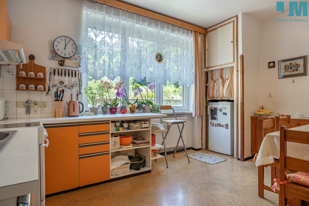 Kuchyně s možností jídelního koutu, praktický prostor pro pračku a umyvadlo – ideální řešení bez nutnosti chodit do koupelny, samostatné WC, prostorný obývací pokoj s krbem, který navodí příjemnou atmosféru během chladných večerů.. z obýváku je také přístup na balkon s výhledem do okolí. Podlaha v okolí krbu je obložena elegantní benátskou dlažbou, která je nejen estetická, ale i praktická.
