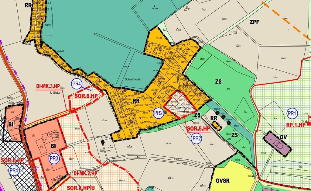 Přístup je zajištěn z obecní komunikace. Elektrická přípojka je již zhotovena, obecní kanalizace a vodovod jsou přivedeny k hranici pozemku. Dle platného územního plánu spadá pozemek do kategorie Rodinná rekreace (RR), která umožňuje výstavbu rekreačních objektů – chalup, chat, domků či jiných drobných staveb určených k rekreaci. Maximální zastavitelnost pozemku činí 25 %. V této zóně je přípustná výstavba jednopodlažního objektu s možností podsklepení (zapuštěný suterén) a využitím podkroví. Na pozemku je vydané platné stavební povolení na dům.