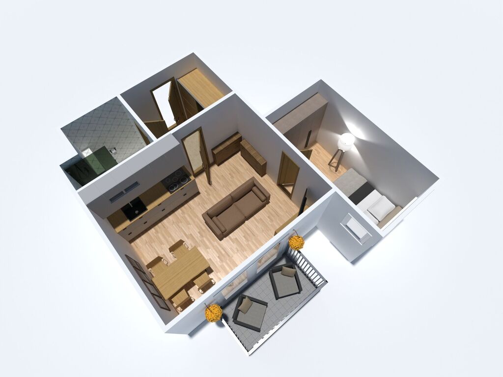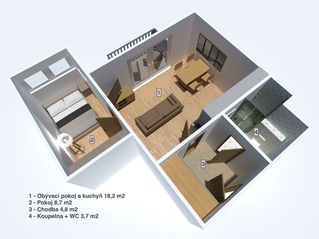 • Byt je v osobním vlastnictví, má celkovou výměru 36 m² + terasa orientovaná na jih