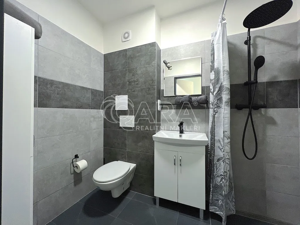 Koupelna disponuje sprchovým koutem s černou nástěnnou baterií, závěsným WC se splachovacím systémem Geberit, umyvadlem se skříňkou a černou baterií. Podlahy v koupelně, kuchyni a předsíni tvoří velkoformátové obklady a dlažba v antracitovém designu. Obytný pokoj je osazen laminátovou podlahou v šedém odstínu.