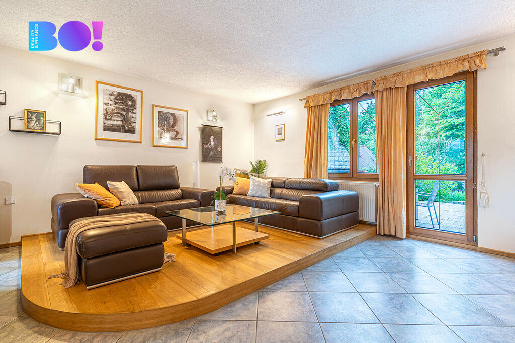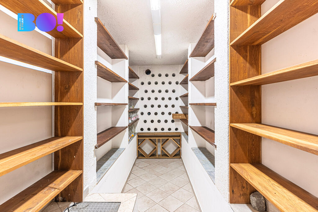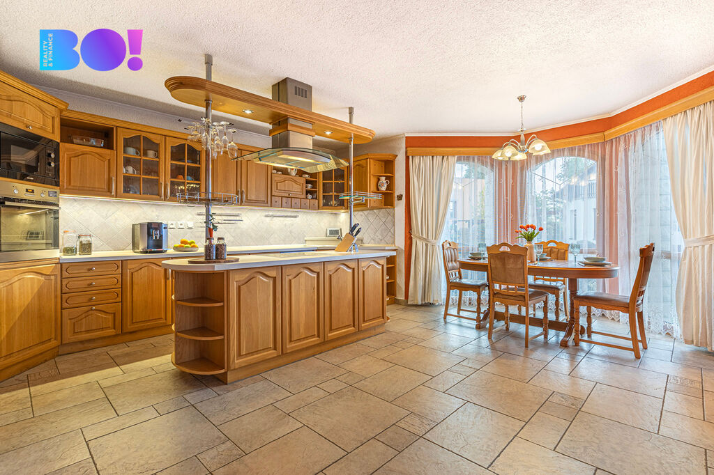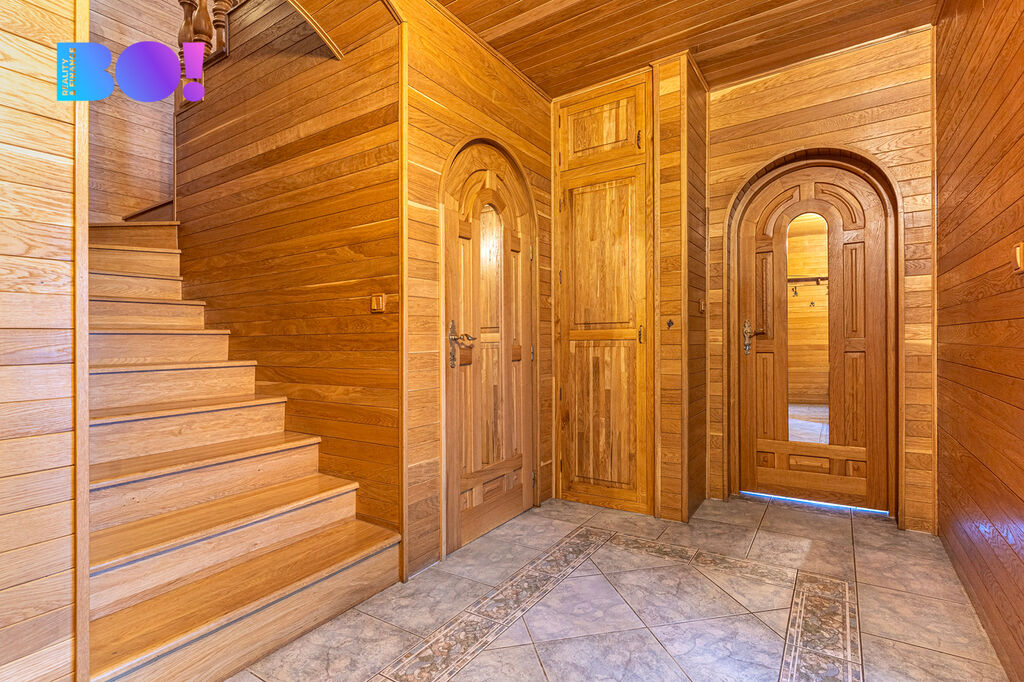 V přízemí domu se nachází obývací pokoj se vstupem na terasu, ložnice, kuchyňská linka s jídelní částí a také vstup do sklepa. V prvním patře se pak nachází ložnice a dětské pokoje, které mají šatnu. Je zde i sauna a prostor pro bazén.