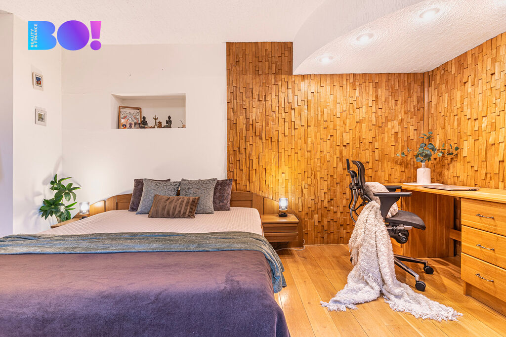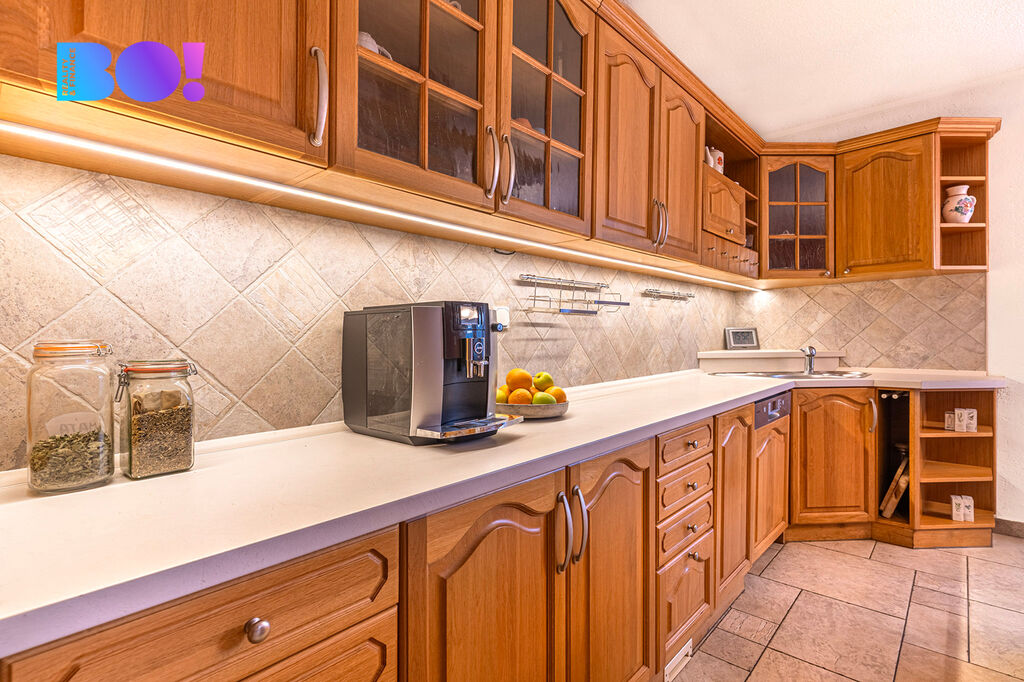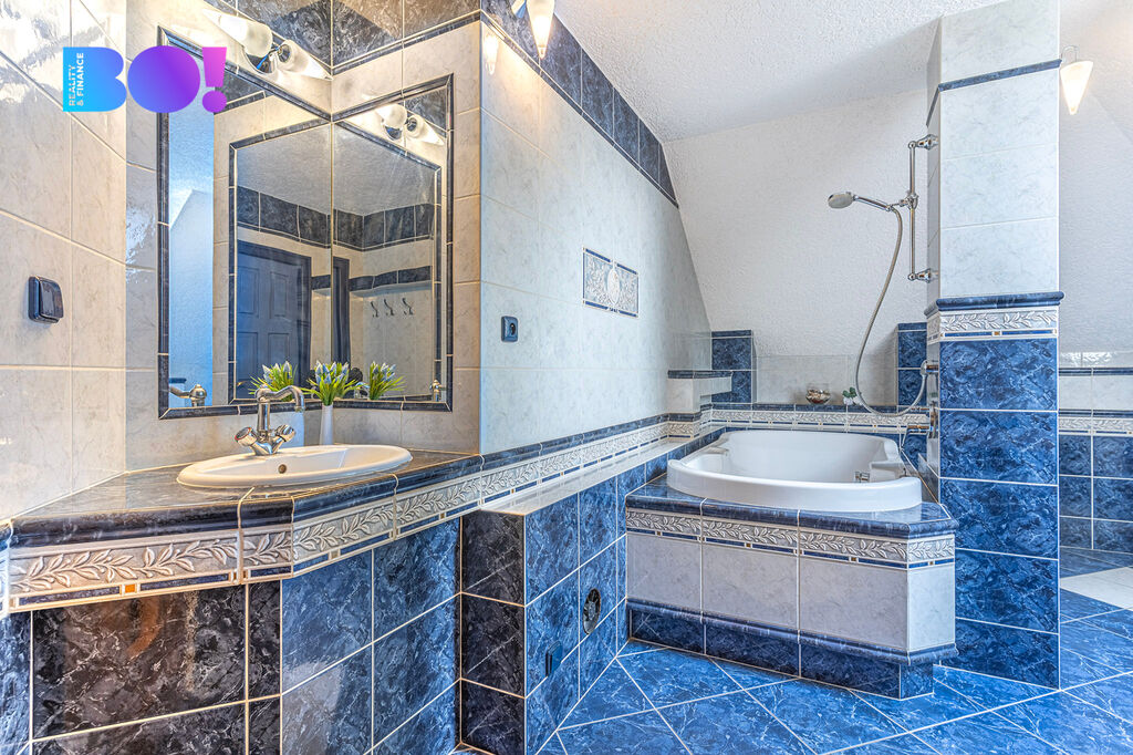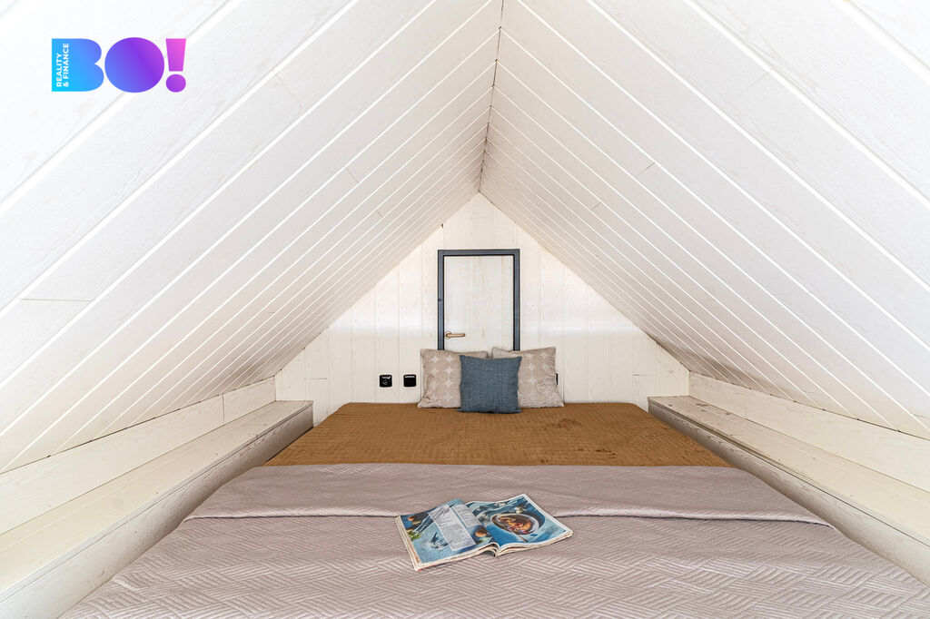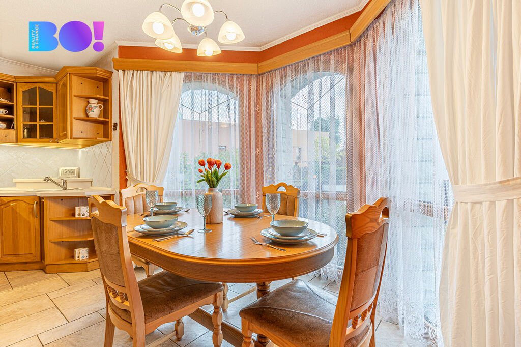 V přízemí domu se nachází obývací pokoj se vstupem na terasu, ložnice, kuchyňská linka s jídelní částí a také vstup do sklepa. V prvním patře se pak nachází ložnice a dětské pokoje, které mají šatnu. Je zde i sauna a prostor pro bazén.