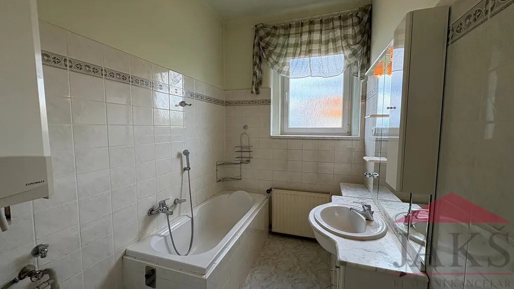 Popis: předsíň 17,55 m2, samostatné WC 2,31 m2, koupelna 5,13 m2 (vana, umyv. se zrcadlem, vývody na pračku, plynový kotel), bývalý balkon, nyní pracovna 5,33 m2 (šlo by obnovit po vybourání zdi anebo rozšířit do velké předsíně a přestavět na pokoj), kuchyň 17,58 m2 (kuch. linka s plynovým sporákem s el. troubou) s jídelnou, spíž 2,54 m2, komora 4,67 m2, prostorný obývací pokoj 29,97 m2 a 2x ložnice 23,31 m2 a 20,14 m2.