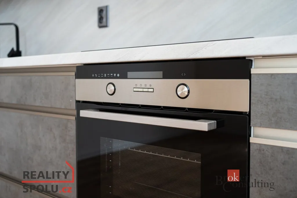 Nová kuchyňská linka vybavená spotřebiči značky Concept (indukční deska, elektrická trouba, mikrovlnná trouba), elegantní digestoří Klarstein a spolehlivými spotřebiči Beko (myčka, lednice).