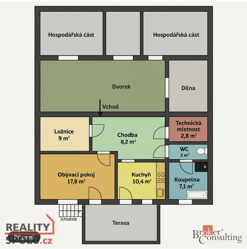 První patro domu prošlo kompletní rekonstrukcí. Chodba, technická místnost a WC je potřeba pouze dokončit v podobě omítnutí a pokládky podlah a to zejména z důvodu plánované rekonstrukce horního patra. Půdní prostor nabízí potenciál k dalšímu rozšíření – díky připraveným základům je možné zvýšit střechu a vytvořit plnohodnotné obytné podkroví dle vlastních představ.