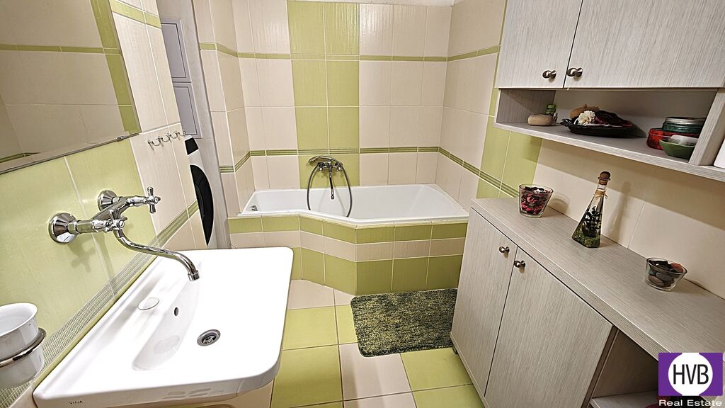 Dispozice bytu zahrnuje dostatečně prostorný obývací pokoj s otevřeným propojením s moderně vybavenou kuchyní a vstupem na lodžii (7 m²), směřující do zeleně. Dále jsou v bytě dvě samostatné ložnice, předsíň se vstupem do všech místností, koupelna s vanou, samostatné WC a komora. K bytu náleží dvě sklepní kóje (3 m²). K dispozici je společná kolárna, přímo před domem se nachází velké parkoviště.