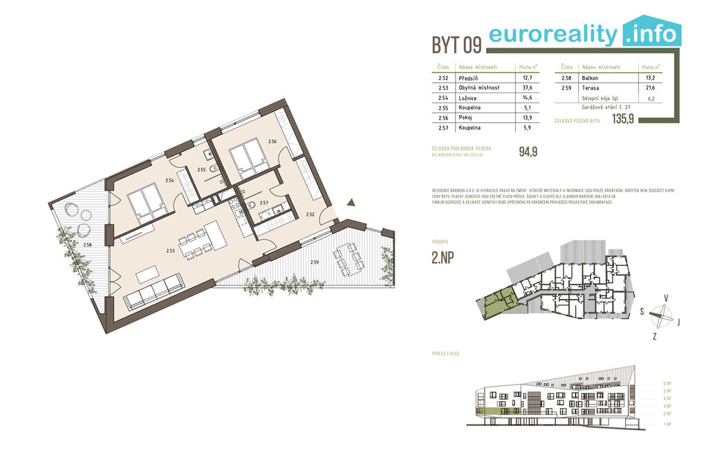 Celková užitná plocha bytu 94,9 m², balkónu 13,2 m² a terasy 21,6 m² zajišťuje pohodlné a prostorné bydlení. Se sklepní kójí o rozměru 6,2 m² činí celková plocha bytu 135,9 m². Apartmán je koncipován tak, aby byl maximálně funkční a zároveň esteticky přitažlivý. Balkon i terasa nabízí krásný výhled do okolní přírody, ideální pro relaxaci o víkendech či při večerním odpočinku.