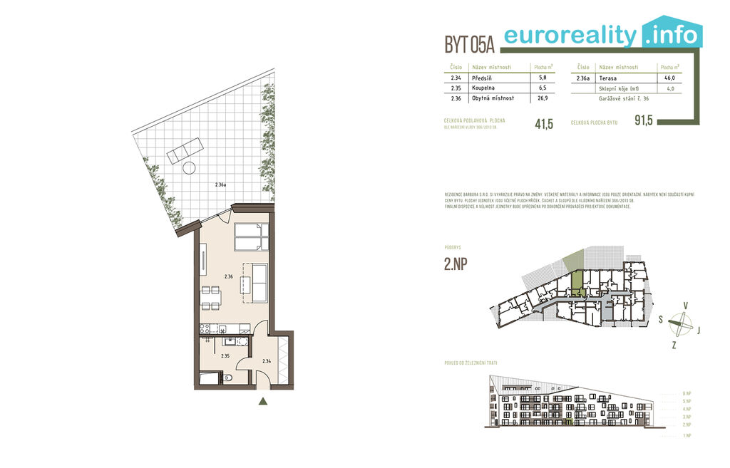 Celková užitná plocha bytu 41,5 m² a terasy 46 m² zajišťuje pohodlné a prostorné bydlení. Se sklepní kójí o rozměru 4 m²