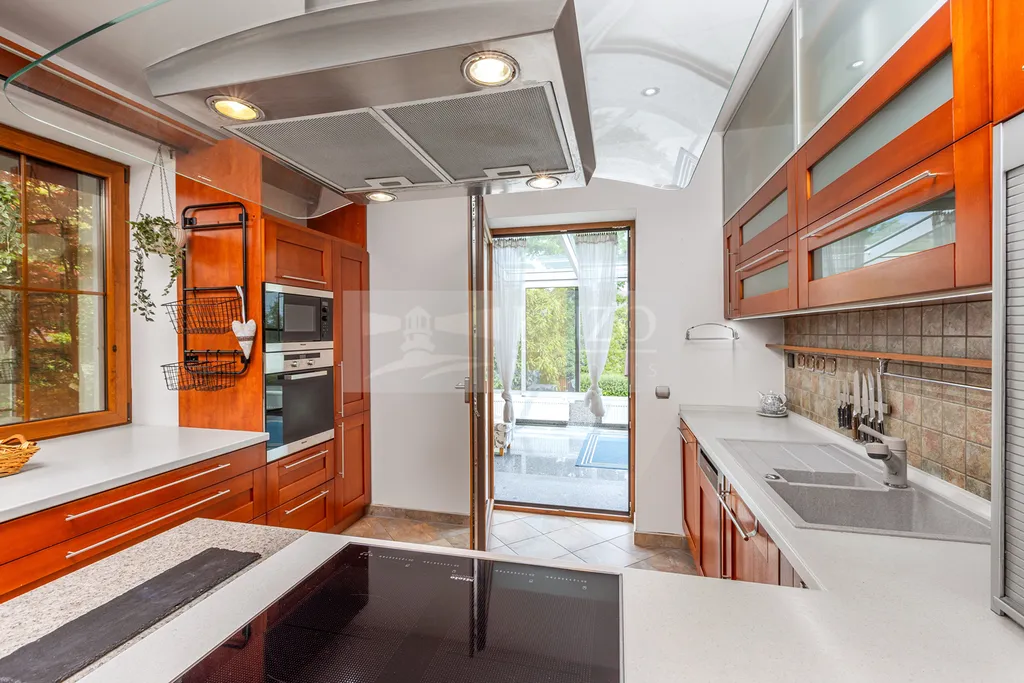 Na prostorný obývací pokoj s kuchyňským koutem plynule navazuje vytápěná zimní zahrada, která nabízí ideální prostor pro odpočinek během celého roku – ať už si užíváte ranní kávu, nebo večerní posezení s výhledem do zahrady.