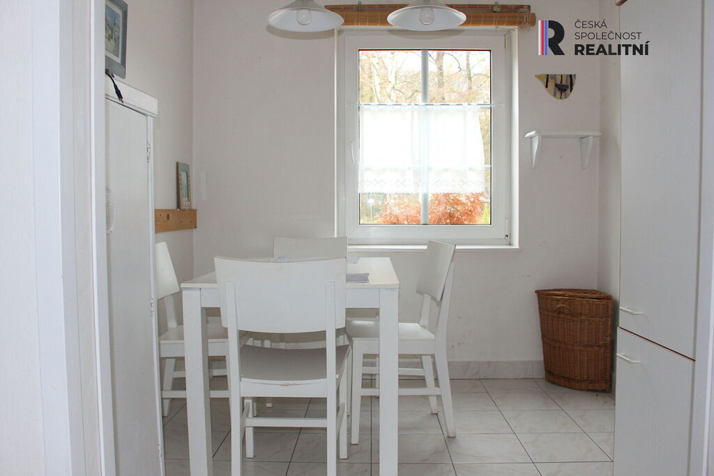 vstup do domu je řešen přes menší zádveří, ze kterého vstoupíte do hlavní obytné části, obývacího pokoje se vstupem do ložnice, menší jídelnou a kuchyňkou. Tato část disponuje podlahovým vytápěním a jsou zde i krbová kamna. V přízemí se nachází velká koupelna se sprchovým koutem a toaletou a při vstupu z chodbičky ještě jedna samostatná toaleta.