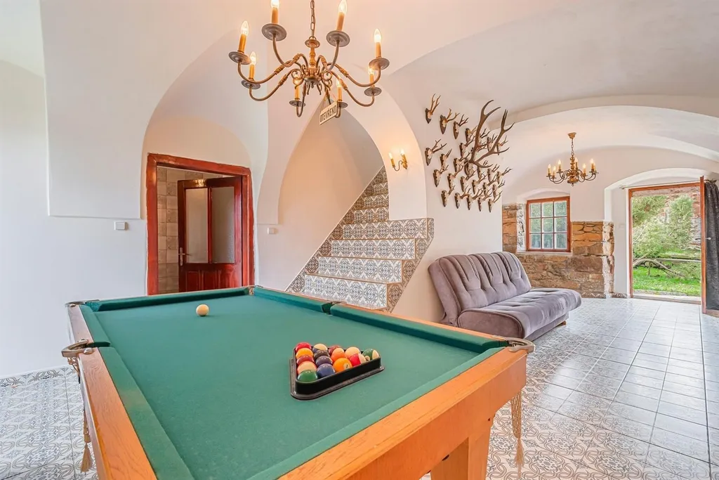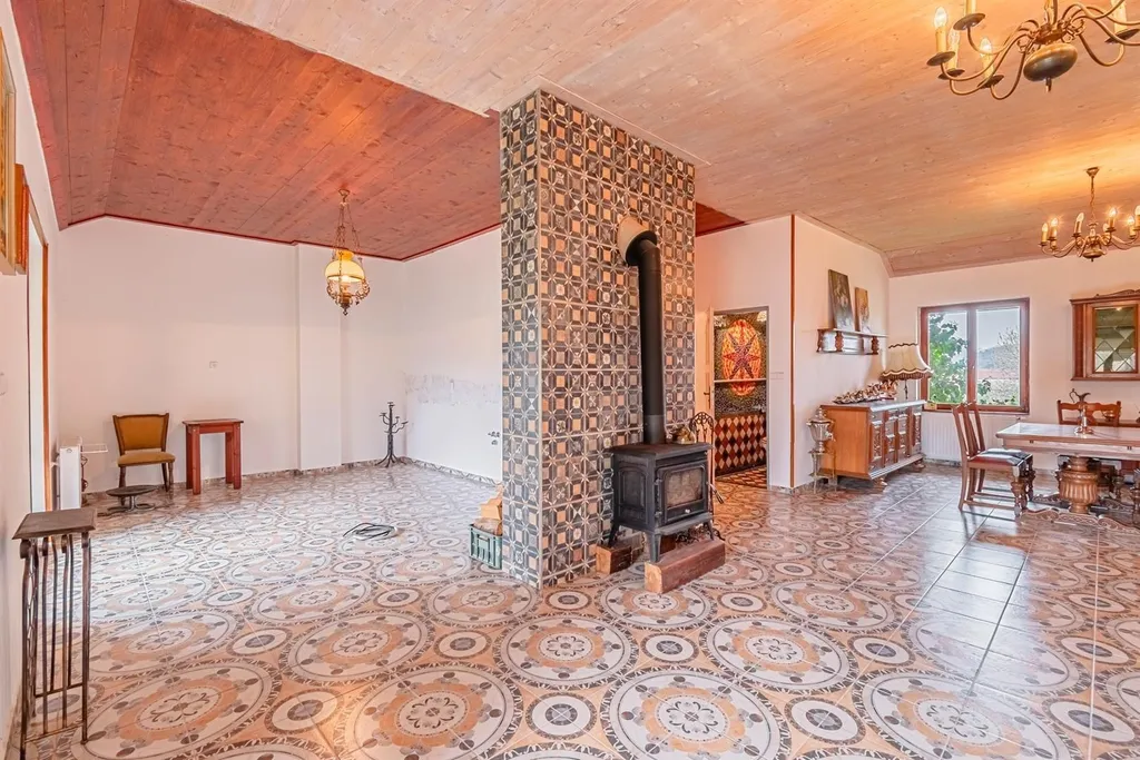 Ve víceúčelovém prostorném domě s úžasnou atmosférou, který po rekonstrukci působící jako šlechtické sídlo, malý zámeček, je veškeré zázemí k využití jak pro rekreační účely, tak i pro trvalé bydlení větší rodiny, společenství. V dispozičně prakticky řešeném dobře prosvětleném domě jsou pokoje ubytovací i velké společenské prostory, v přízemí vše připraveno pro velkou jídelnu, kavárnu, s úpravami využitelnou i jako restauraci. Prostoru pro kavárnu, restauraci, dominuje otevřený renovovaný krb, připravený i na možné vsazení dvouplášťové krbové vložky.