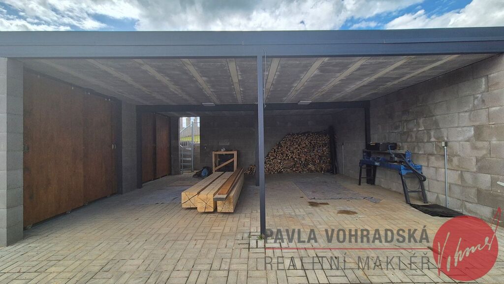 Kryté stání pro 2 vozy 44, 1 m s BIO střechou + zahradní sklad + další 2 parkovací místa