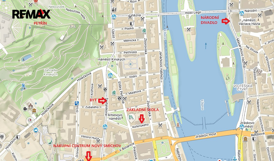 Velmi žádaná lokalita pár metrů od Arbesova náměstí nedaleko Janáčkova nábřeží, lanovky na Petřín a v blízkosti Nákupního centra Nový Smíchov. Skvělé napojení MHD, ale na této adrese je centrum města na dosah. Veškerá občanská vybavenost je zde samozřejmostí a vše v pěším dosahu.