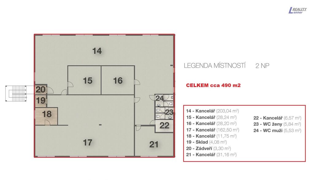 Celkem k dispozici cca 490 m2 užitné plochy ve 2. nadzemním podlaží, kde se nachází převážně kancelářské prostory a prostorné akusticky řešené callcentrum, vč. příslušenství (kuchyně s jídelnou, relaxační místnost pro zaměstnance, zasedací místnost a otevřený openspace kanceláří, vč. oddělených toalet a serverovny).