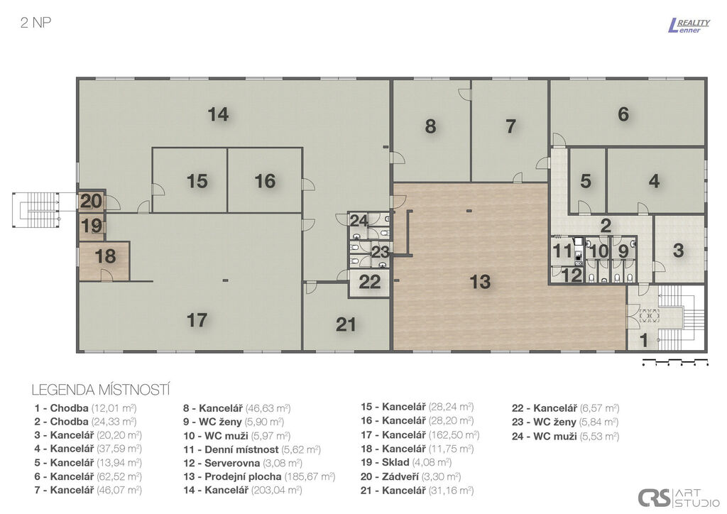 Celkem k dispozici cca 954 m2 užitné plochy ve 2. nadzemním podlaží, kde se nachází velmi lukrativní, obchodní prostory vč. akusticky řešeného callcentra, několika kanceláří a příslušenství (kuchyně s jídelnou, sklady, archiv, serverovny, oddělené toalety).