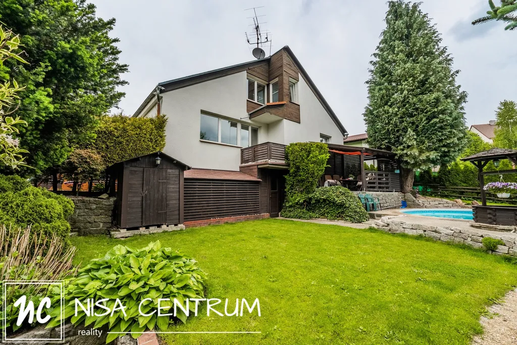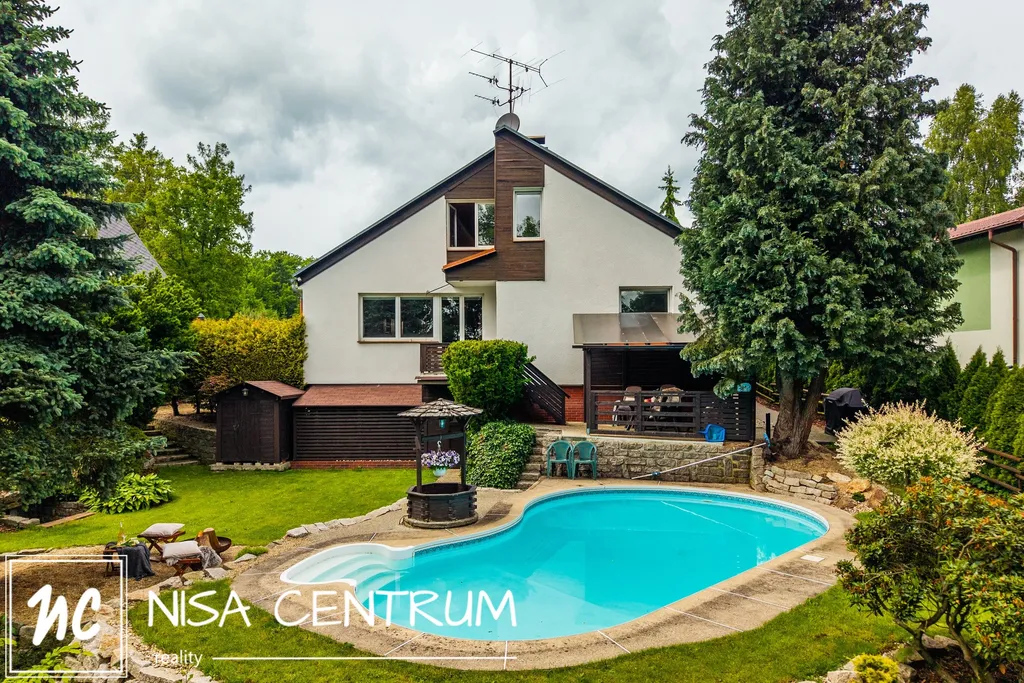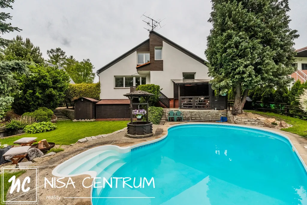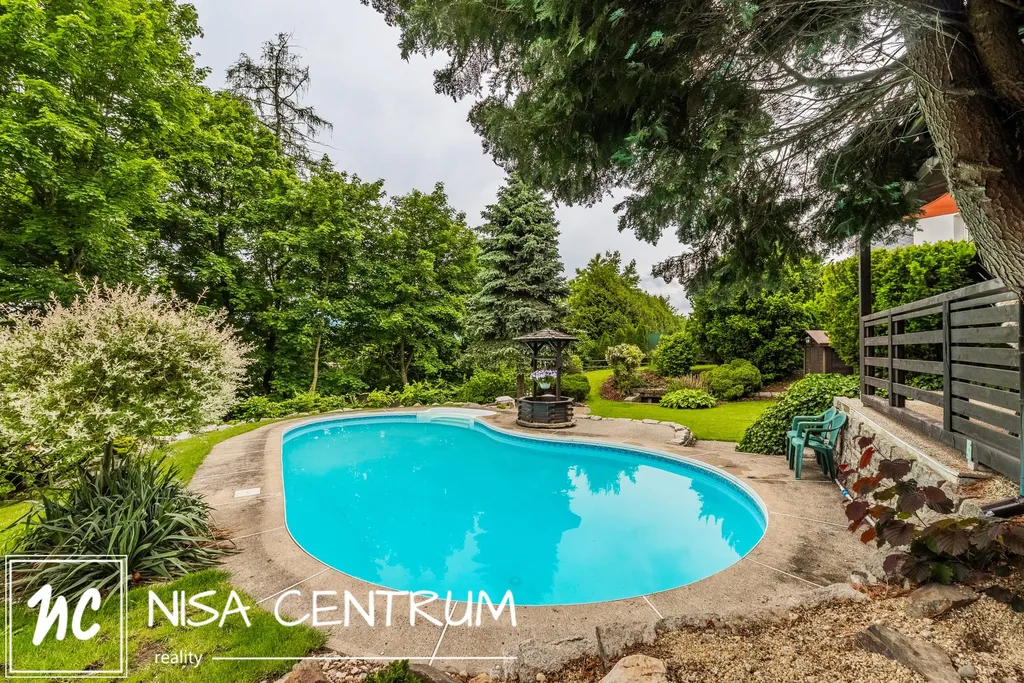Za domem se nachází naprostá oáza klidu s nádherným atypickým bazénem, dostatečně velkou pergolou pro posezení v letních měsících, dětské hřiště a menší sklípek. Zahradu navrhoval profesionální zahradník.