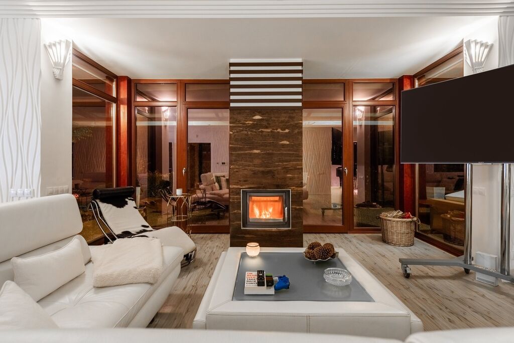 3 moderní krby - venkovní, ve společenské zóně v suterénu a v obývacím pokoji