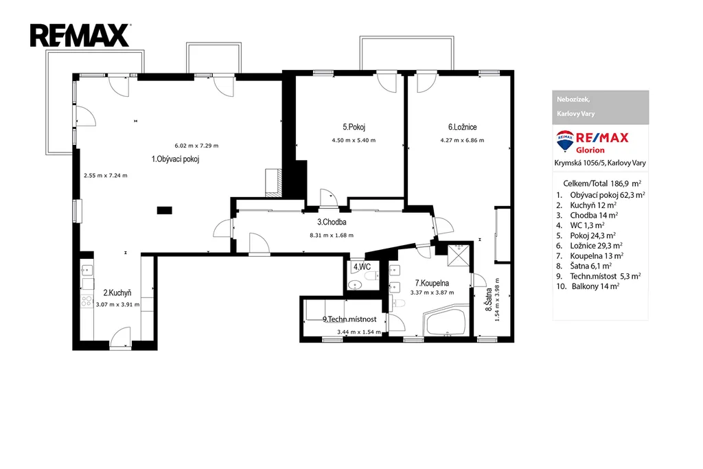 Byt zaujme nejen svým umístěním, ale především výhledem. Tři slunné balkony (4,1 m², 2,4 m² a 6,1 m²) směřují na jihovýchodní stranu a nabízejí dechberoucí panoramatické pohledy na centrum města, okolní lesy a ikonický Hotel Pupp. Jsou ideálním místem pro ranní kávu i klidné večery s výhledem.