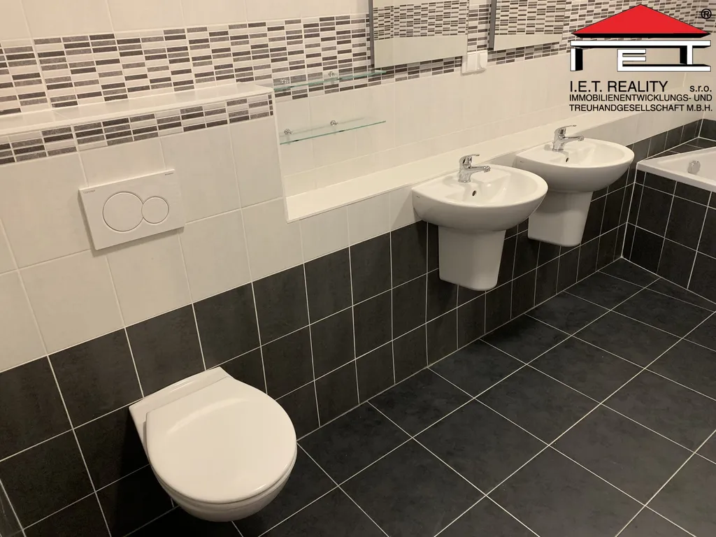 Koupelna se sprchovým koutem a wc, ohřev vody bojlerem. Místnost má velké francouzské okno, orientované do vnitrobloku - do zahrádky.