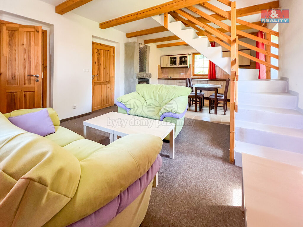 Na pozemku stojí samostatný menší domek, ve kterém je další apartmán s kuchyní, obývací částí a ložnicí v patře.