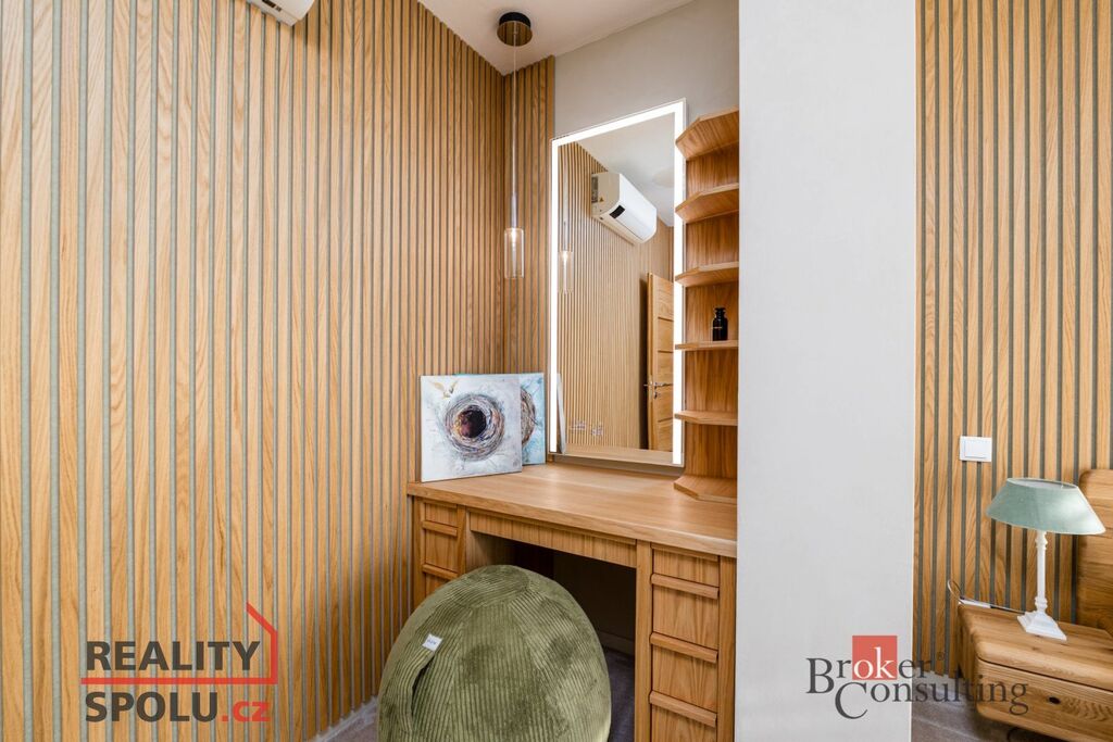 Jednotka o dispozici 3+kk ( 78 m² ) s prostornou šatnou je situována v posledním, pátém patře moderního domu a nabízí absolutní klid, soukromí a výjimečný standard bydlení. Největší dominantou je terasa o rozloze úchvatných 80 m², která obepíná celý byt a byla navržena jako soukromá relaxační zóna. Naleznete zde bioklimatickou pergolu, vířivku a vzrostlé stromy se samozavlažovacím systémem, které zajišťují maximální soukromí a navozují atmosféru luxusního apartmánu v přírodě. Každý vstup na terasu je tak malým únikem z města – do zeleně a ticha přilehlého parku.