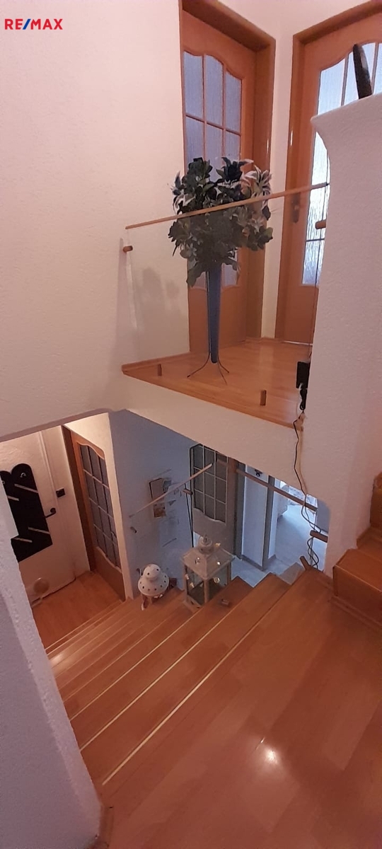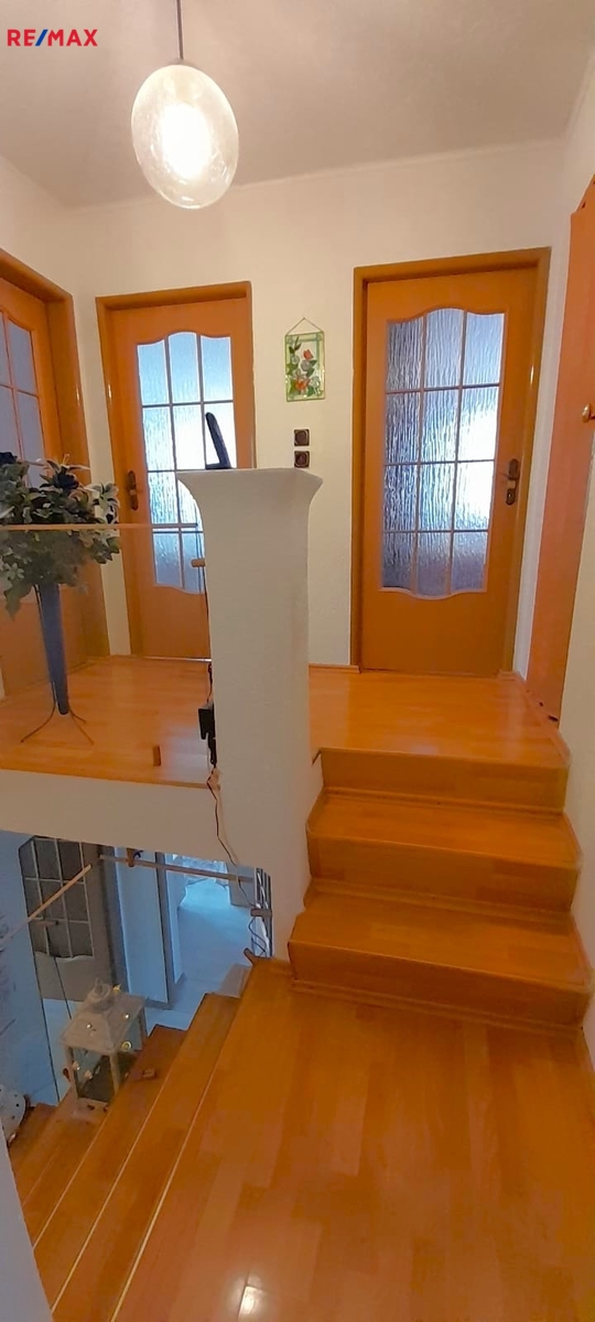 Po dřevěných schodech vyjdeme do patra, kde se nachází byt 4+1 se zasklenou lodžií.
